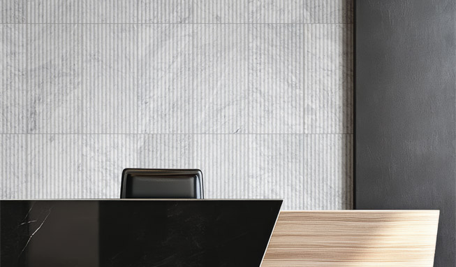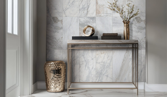 Classic Italian marble meets fluted architectural slats, creating a dynamic allure to feature walls in foyers, kitchens, bathrooms, and beyond.