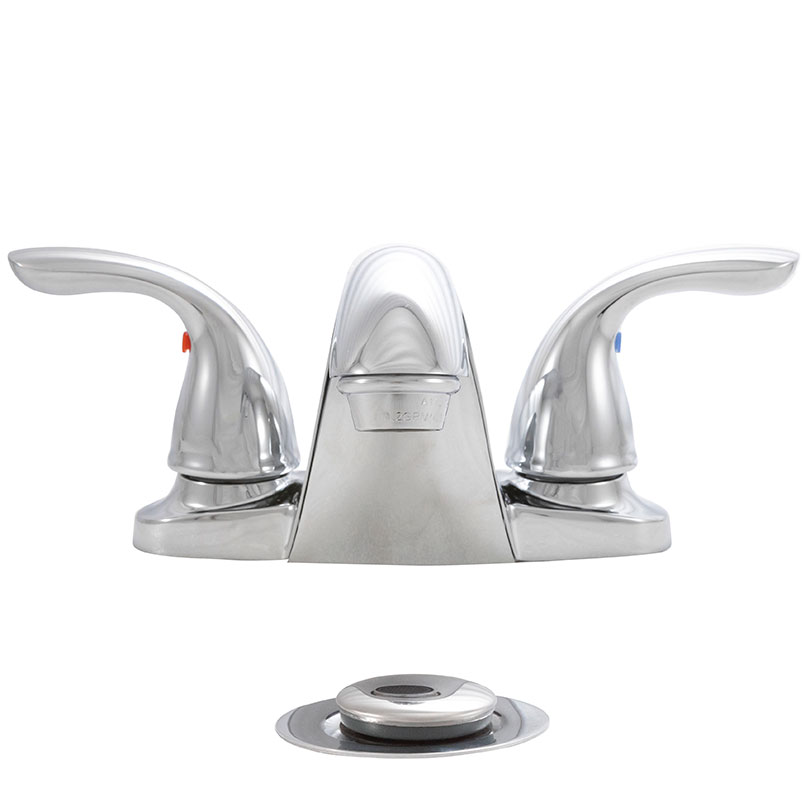 This attractive 4-inch centerset Bathroom Faucet features a contemporary spout in a chrome finish and easy-to-use handles. Discreet red and blue markings allow for easy temperature control. It is available with a matching ABS Plastic pop up drain and a washerless cartridge to help prevent wear and tear. The faucet also features a hybrid waterway […]