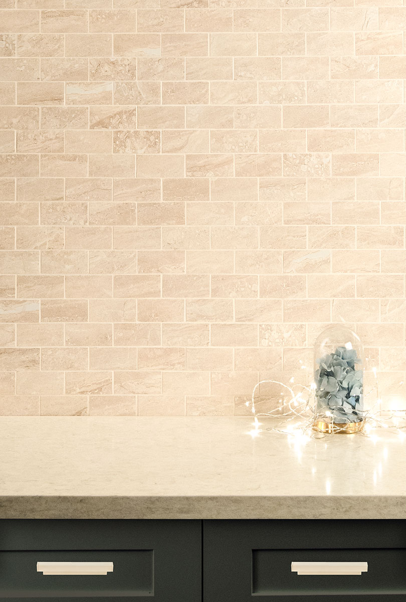 These beautiful porcelain subway tiles are crafted to resemble natural stone. With their soft beige background and whisps of white and beige veins, they mimic natural stone perfectly. Aria Oro Subway Tile with a polished finish is recommended . Contact MSI for this backsplash tile.Order Sample