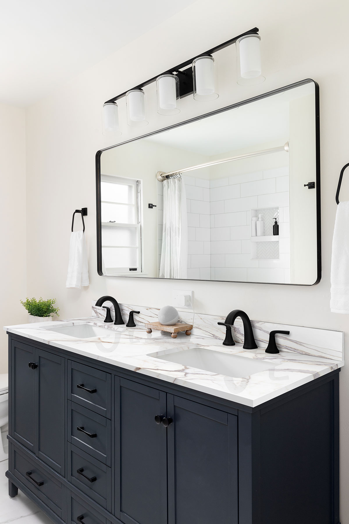 fun, girly & classy – 3 words to describe this sweet bathroom that we designed for a teen girl 💫🤍 so many details to focus on but our favorite might be the quartz shower 👌🏻