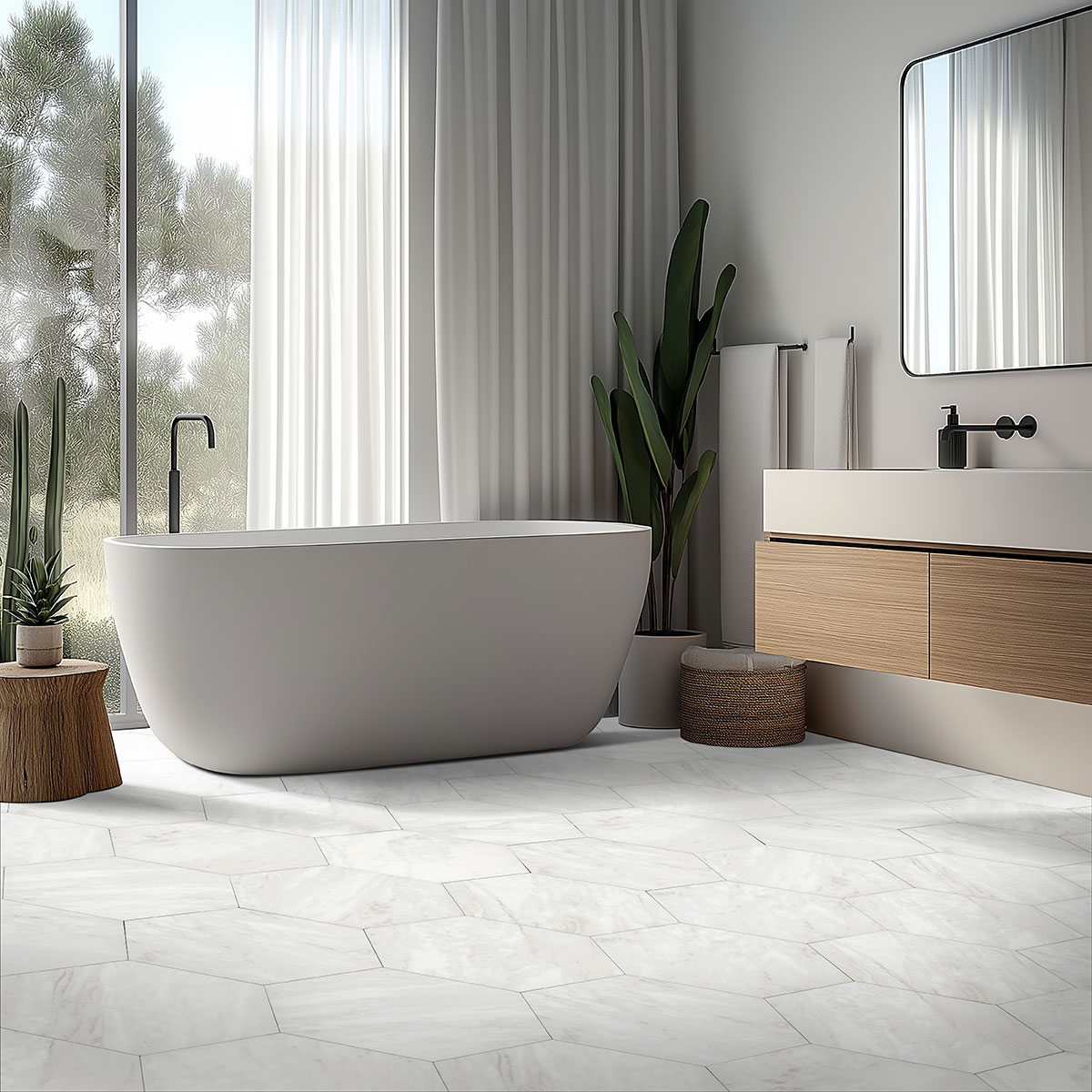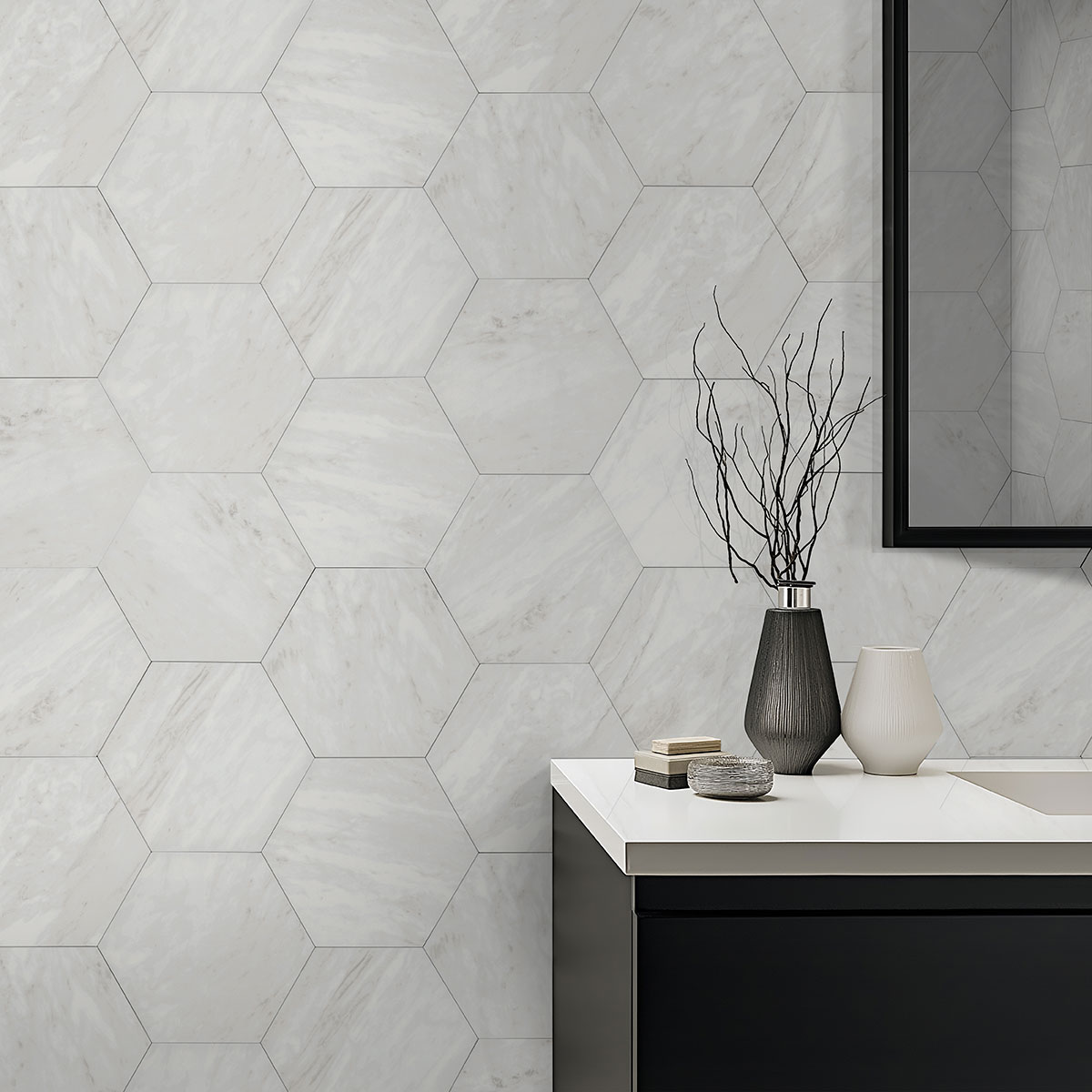Sophisticated and effortlessly chic, Calacatta from the GeoGlam Collection turns any space into a masterpiece. These 11” x 13” hexagonal tiles capture the timeless beauty of Calacatta marble, offering the intricate look of a waterjet mosaic with the easy maintenance of porcelain. A sleek matte finish enhances its elegance, making it perfect for floors, walls, […]