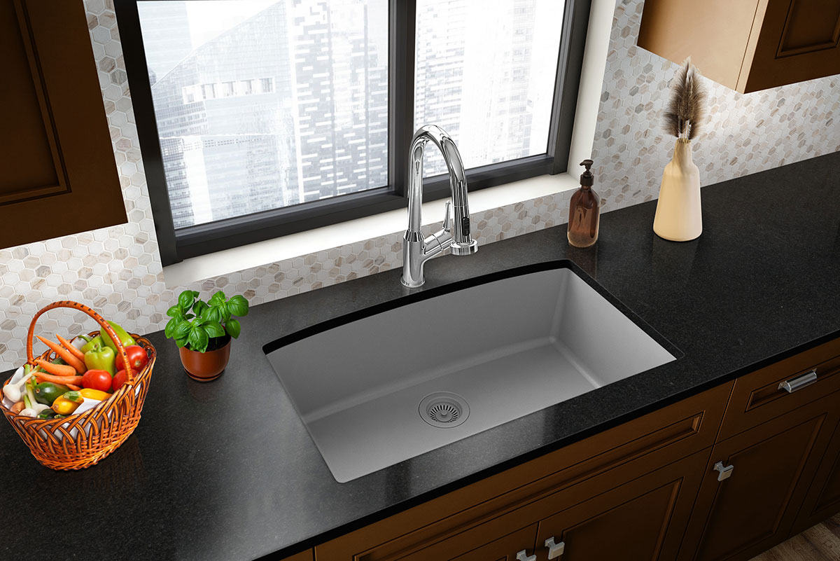 This gorgeous grey quartz single bowl undermount sink is scratch, stain, and germ resistant. With one generous 9β deep basin, it easily accommodates your large cookware and stacks of dishes. An ideal choice for busy homes and light commercial environments, this quartz sink is designed to be heat resistant up to 535 degrees Fahrenheit and […]