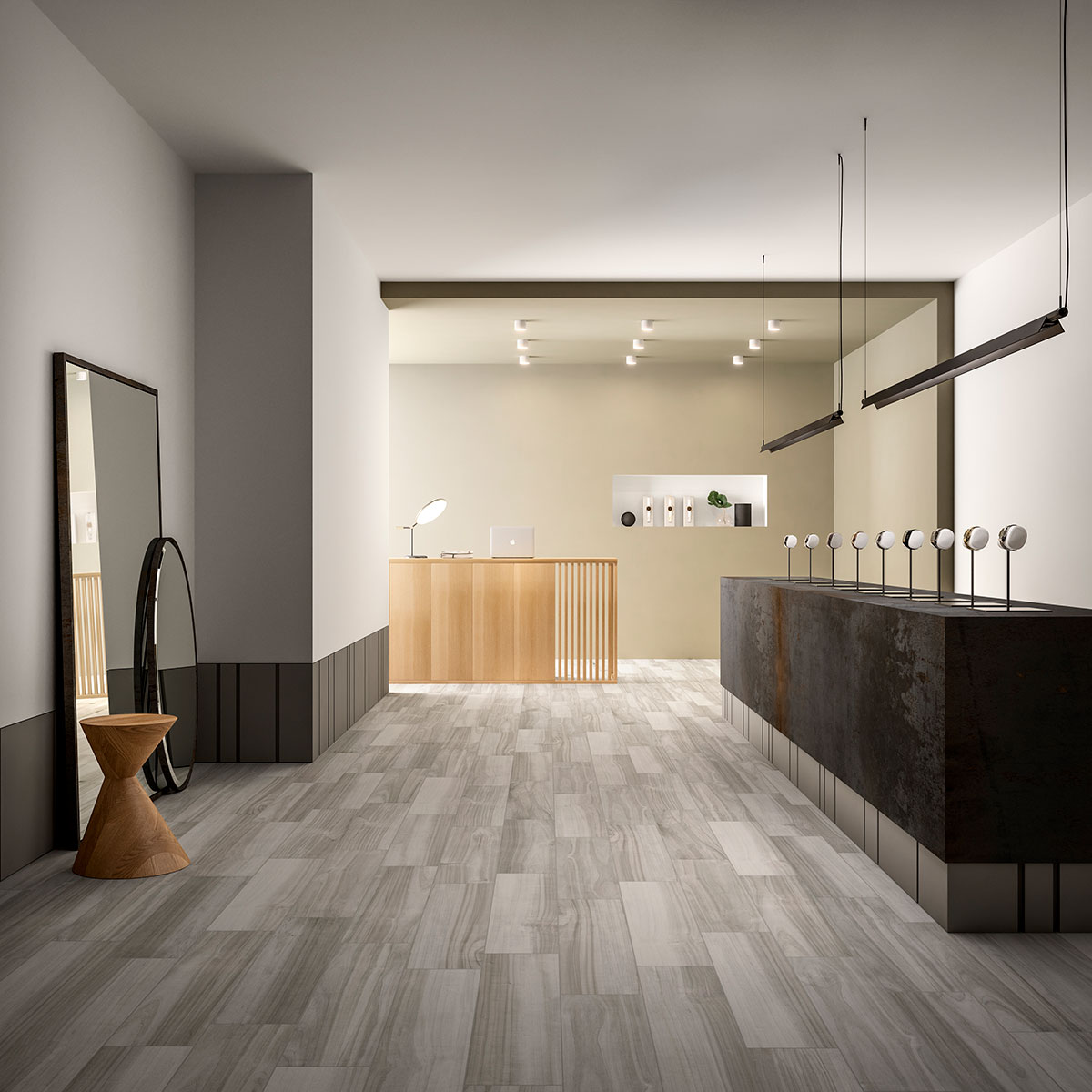 The cool steely gray tones of Platinum Wood Look Tile from the Havenwood collection has a decidedly contemporary feel. Striking and sophisticated, this wood look tile is suitable for a wide range of projects including floors, countertops, accent walls, and other features. Offered with a matte finish and non-rectified edges, 8×36 planks and 12×15 chevron […]
