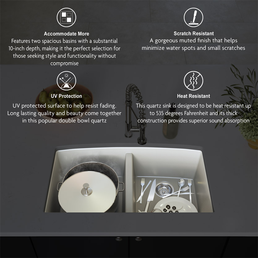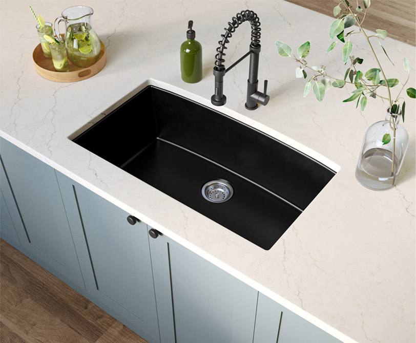 Our Quartz Composite Sinks collection provides a modern aesthetic with a selection of black and grey options in both double and single bowl configurations. These sinks are designed for durability and easy maintenance, featuring a depth of 9 inches to accommodate larger dishes, and undermount installation for a seamless counter finish.