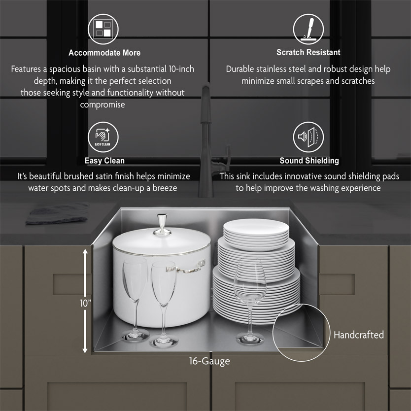 Meet the 33” x 19” x 10” undermount workstation sink—engineered for durability and style with robust 16-gauge stainless steel and a satin finish. The fully undercoated interior minimizes noise, while included accessories like a cutting board, colander, and rolling mat redefine functionality. Experience a seamless blend of design and practicality in your kitchen.